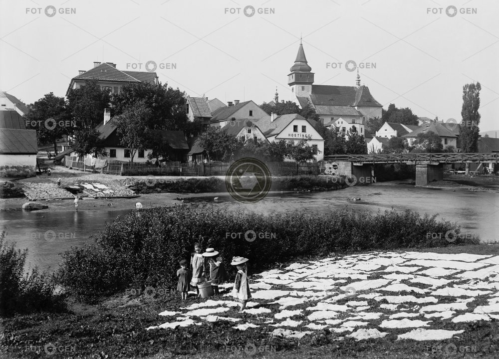 bělení bleaching bridge děti hostinec children church inn kostel linen místopis most Posázaví práce prádlo river řeka Sázava Světlá nad Sázavou topography work