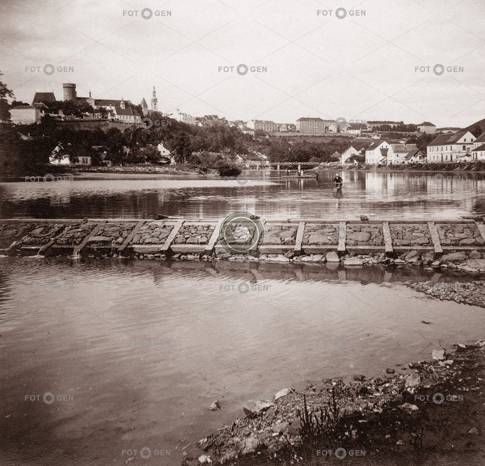 bridge břeh celkový pohled city general view jez Kotnov loď Lužnice město místopis most river řeka ship shore Tábor topography weir