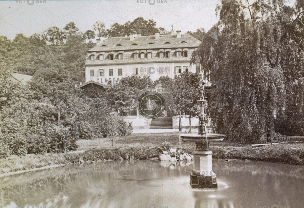 Claser's restaurant Claserova restaurace fontána fountain hotel Golden ship hotel Zlatá loď lázeňský park lázně místopis pond rybník socha spa spa park statue Teplice Teplitz topography