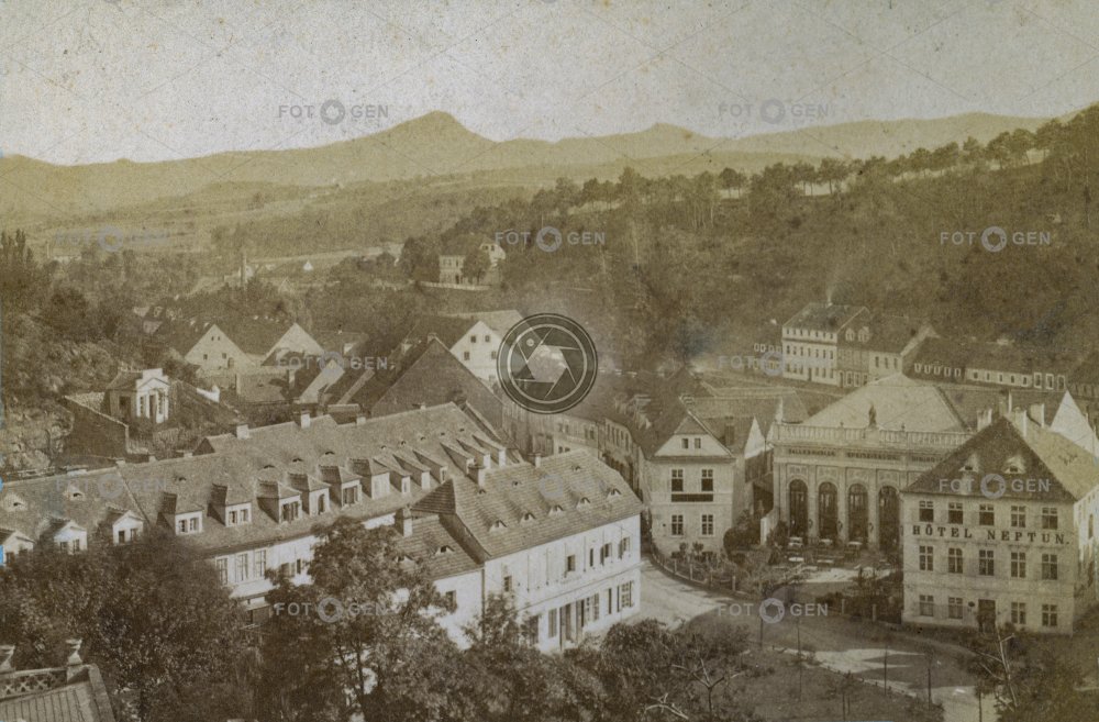 bird's eye view dining room hotel Neptun jídelna lázně Milešovka místopis Prague street Pražská ulice ptačí perspektiva spa Teplice Teplitz topography