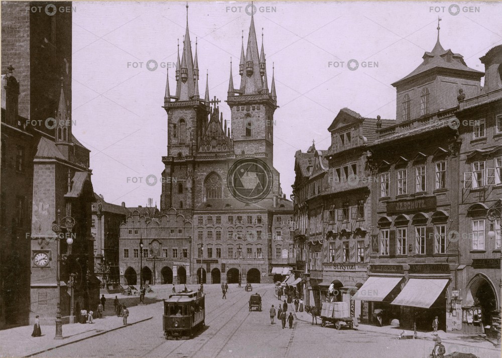 Astronomical Clock léto místopis Old Town Square orloj Prague Praha Staroměstské náměstí summer topography tram tramvaj Tyn Church Týnský chrám