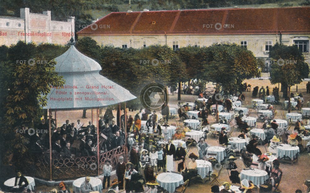 1925 alive altán altánek barevná color colored gazebo Grand hotel host hosté hudebníci kolorovaná leisure letní místopis musician Musiker muzikant muzikanti outdoor seating Slovakia Slovensko topography Trencsénteplic Trenčianske Teplice Trentschin-Teplitz venkovní venkovní posezení volný čas zahrádka zahradní zákazník živá