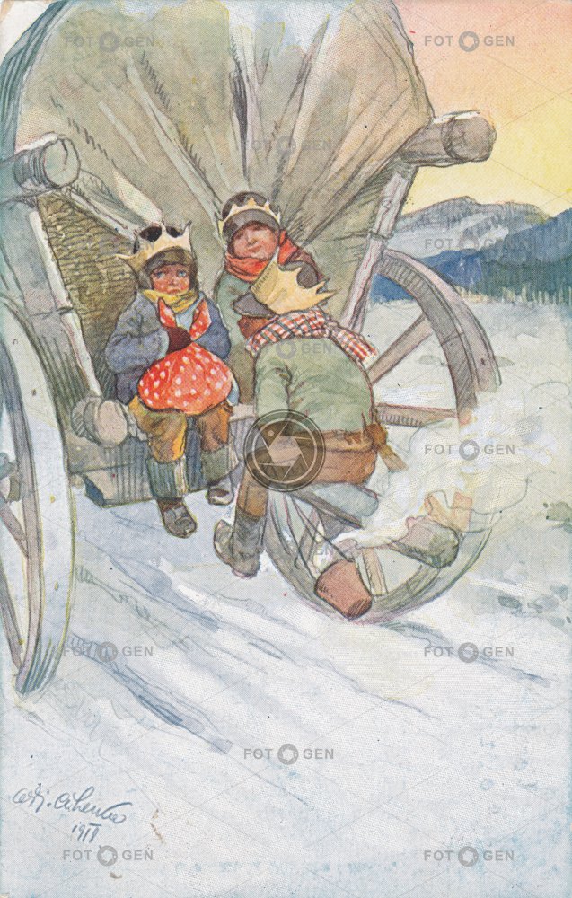 Baltazar carol singers děti Feiertage holidays children Christmas Kašpar koledníci kreslené leisure malované Melichar novoroční nový rok prvorepublikové přání Sternsinger sváteční svátky three Kings tři králové vánoce vánoční vehicle volný čas vůz Weihnachten
