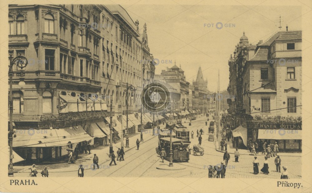 1910 alive Golden Cross lighting markýza místopis Na Příkopě neexistující budova New Town non-existent Nové Město pouliční hodiny pouliční lampa Prague Praha Příkopy street clock street lamp street lamps topography tram tramvaj Václavák Václavské náměstí Ve starých alejích Wenceslas Square Zlatý kříž živá