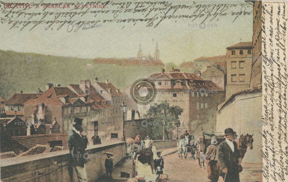 1906 alive barevná cab carriage color colored dobové oblečení drožka fiakr horse hotel Hradčany church Ke hradu Kirche kočár kolorovaná kostel kůň lidé Menschen místopis Nerudova pouliční ruch pouliční život povoz Prague Praha Strahov street traffic topography vehicle vůz Zlatá hvězda živá