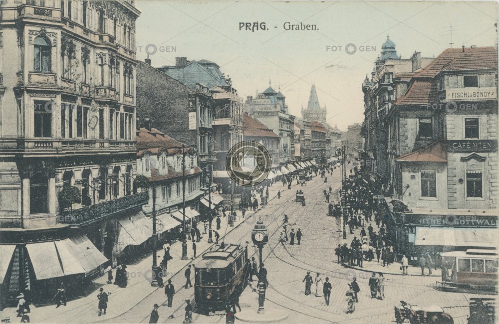 1905 alive barevná colored Golden Cross markýza místopis Na Příkopě pouliční hodiny Prague Praha Příkopy street clock topography tram tramvaj Václavák Václavské náměstí Ve starých alejích Wenceslas Square Zlatý kříž živá