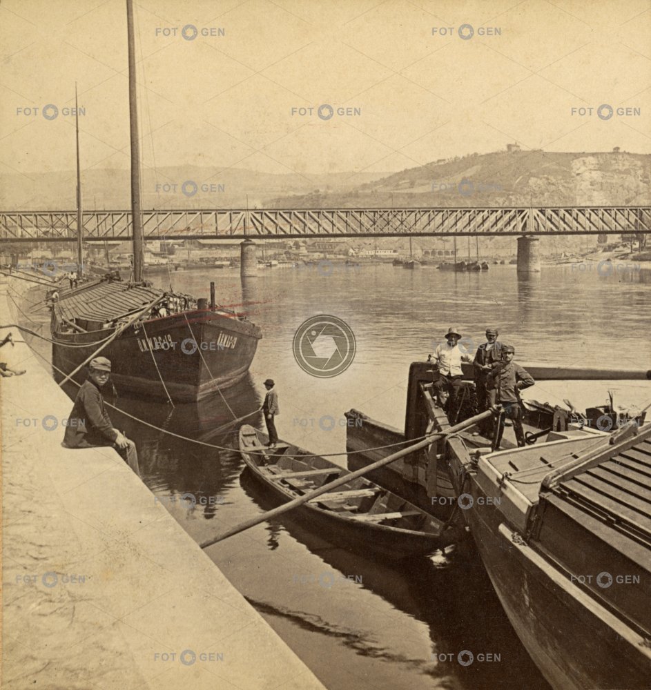 Aussig bridge doprava Elbe Labe lodě lodník místopis most námořník pier práce přístavní molo river řeka sailor ships topography transport Ústí nad Labem work