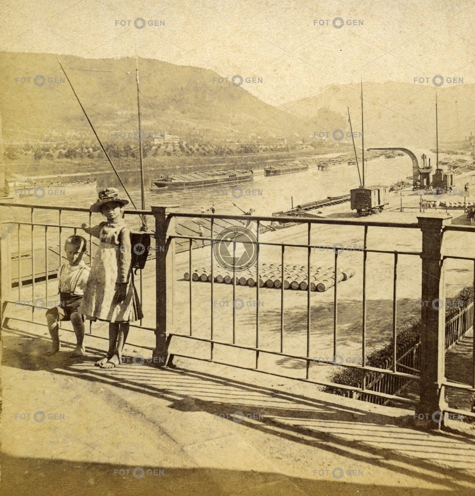 Aussig bridge railing cargo ship děti doprava Elbe children Labe místopis nákladní loď port práce přístav topography transport Ústí nad Labem work zábradlí mostu