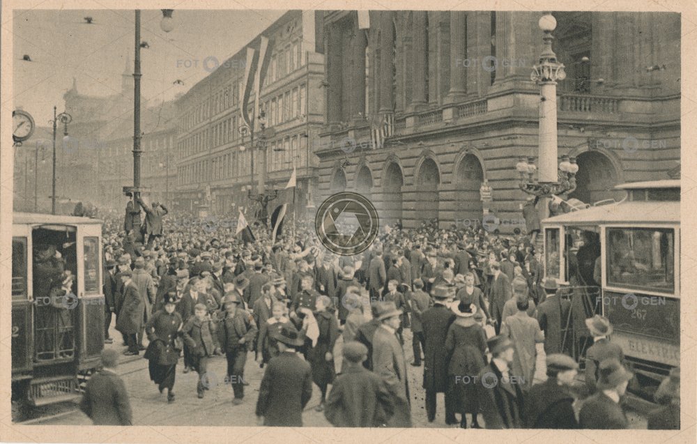 1918 267 28. říjen celebration Československo divadlo event Feier independence lidé lighting Menschen místopis Národní Nové Město osamostatnění oslava osvětlení people pouliční hodiny pouliční osvětlení Prague Praha street clock street lamp topography tram tramvaj událost vznik státu