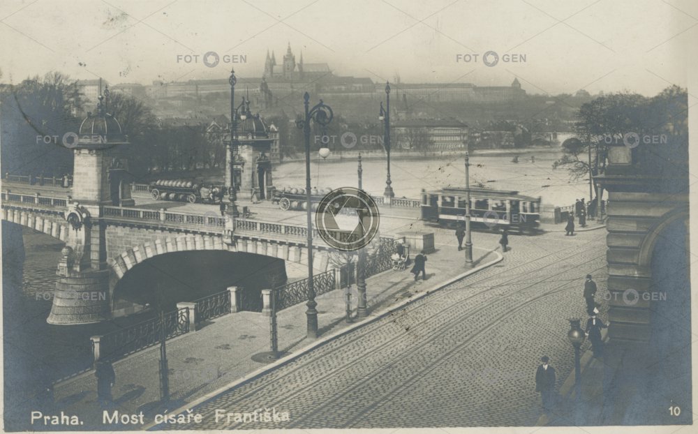 1914 alive barrels bridge břeh řeky Daliborka embankment flatbed horse horse-drawn carriage Hradčany koňský povoz kůň Lesser Town lighting Malá Strana místopis most most Legií mýtné budky nábřeží Nové Město osvětlení pouliční lampa pouliční osvětlení Prague Prague Castle Praha Pražský hrad river řeka street lamp street lamps sudy the New Town toll booth topography tram tramvaj valník Vltava živá