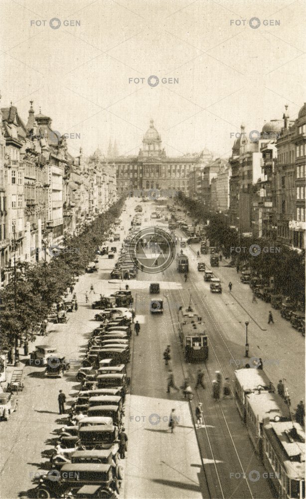 auto automobile automobilismus car celkový pohled doprava chodci místopis museum muzeum parking parkování pedestrians Prague Praha topography traffic tram tramvaj transport Václavské náměstí Wenceslas Square
