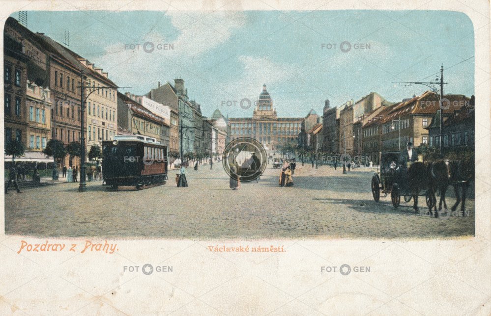 barevná bryčka colored drožka fiakr horse-drawn carriage kolorovaná kořár místopis náměstí Národní muzeum National Museum New Town Nové Město Prague Praha square topography tram tramvaj Václavák Václavské Wenceslas Wenceslas Square