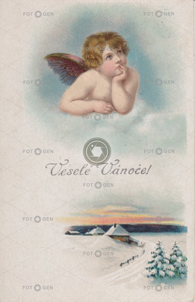 anděl angel Dorf engel Feiertage holidays Christmas kreslené leisure malované novoroční nový rok prvorepublikové přání sněžení sníh sváteční svátky vánoce vánoční vesnice village volný čas Weihnachten zima