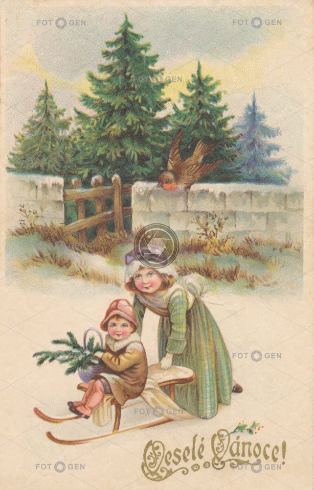 děti dítě Feiertage holidays child Christmas Kind kreslené leisure malované novoroční nový rok prvorepublikové přání sáňkování sáňky Schneeschlitten snow sled sváteční svátky vánoce vánoční volný čas Weihnachten