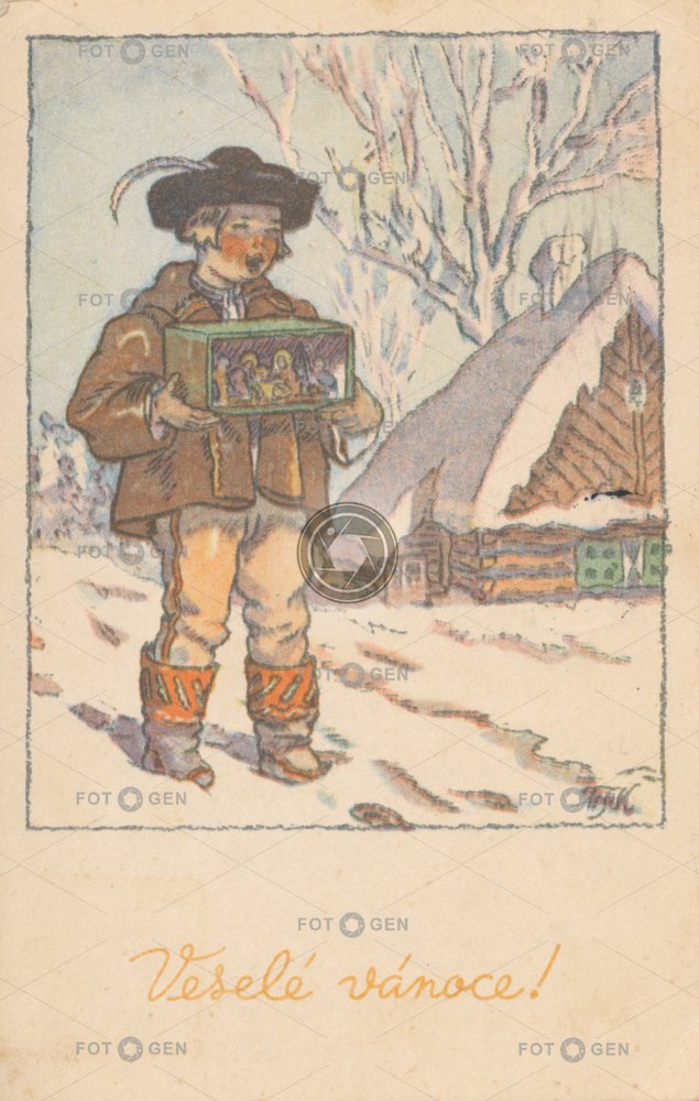 Bethlehem Betlém Boy carol singers Dorf Feiertage folk costume holidays chaloupka chalupa chlapec Christmas junge koledníci kreslené kroj leisure malované novoroční nový rok prvorepublikové přání sníh Sternsinger sváteční svátky vánoce vánoční vesnice village volný čas Weihnachten Weihnachtskrippe zasněžená