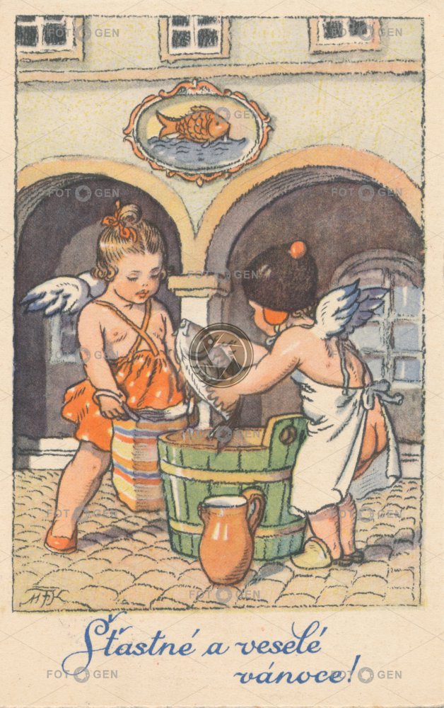 anděl angel děti dítě engel Feiertage fish Fisch holidays child Christmas kapr Kind kreslené leisure malované novoroční nový rok prvorepublikové přání ryba sváteční svátky vánoce vánoční volný čas Weihnachten