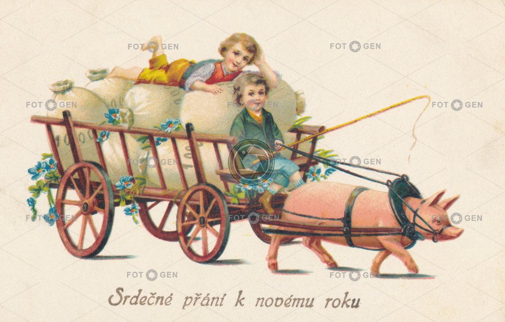 Boy děti dítě Feiertage holidays child chlapec Christmas junge Kind kreslené leisure malované novoroční nový rok pig povoz prasátko prase prvorepublikové přání Schwein sváteční svátky vánoce vánoční vepř volný čas vůz Weihnachten žebřiňák
