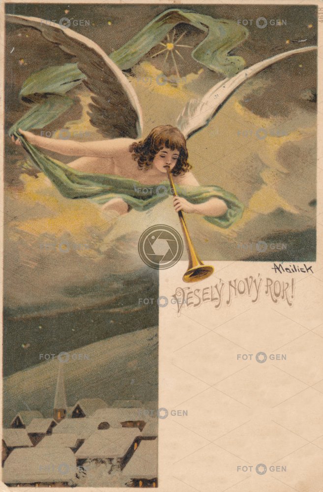 anděl angel engel Feiertage heaven holidays Christmas kreslené leisure malované nebe novoroční nový rok prvorepublikové přání sněžení sníh sváteční svátky trubka vánoce vánoční volný čas Weihnachten zasněžená zima