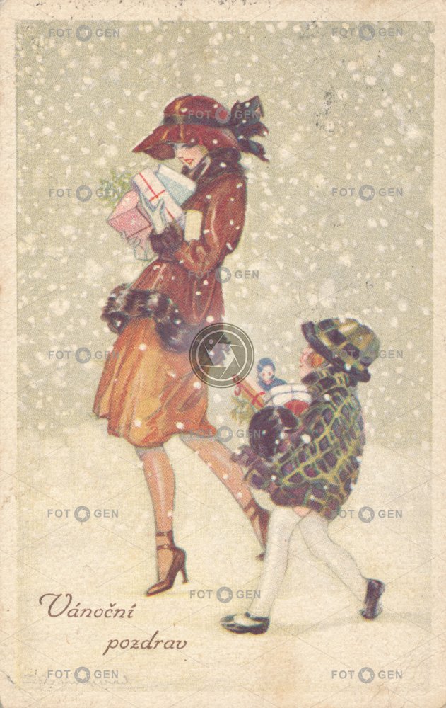 dáma dárky Feiertage Geschenke gifts hat holidays Christmas klobouk kreslené lady leisure malované novoroční nový rok prvorepublikové přání sněžení sníh sváteční svátky vánoce vánoční volný čas Weihnachten zima