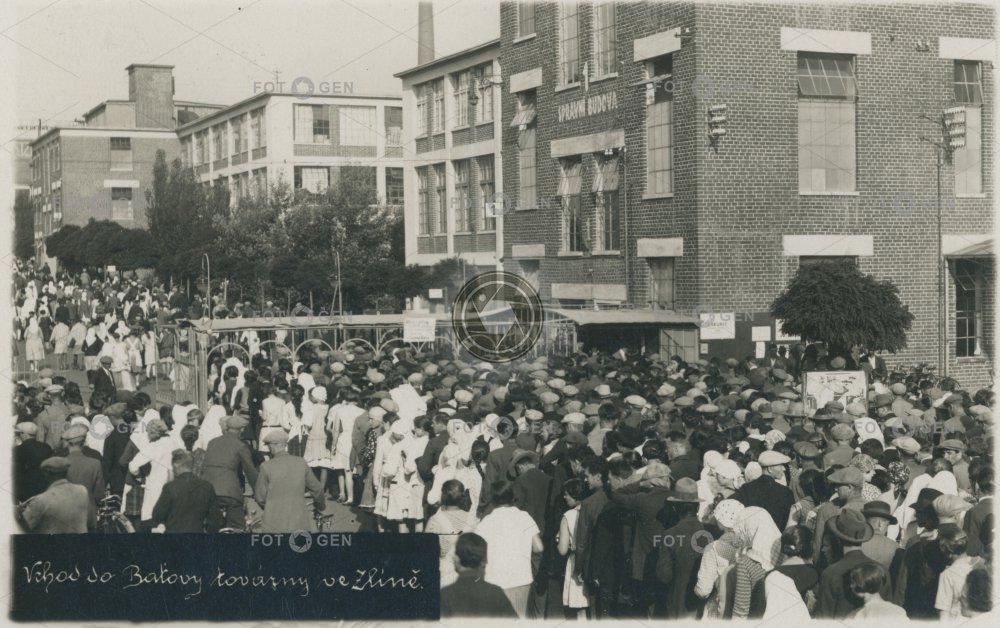 alive Baťa Baťovy brána dělníci employees entrance factory gate Gottwaldov lidé Menschen místopis people pracující správní budova Svit topography továrna vchod vstup zaměstnanci závody Zlín živá