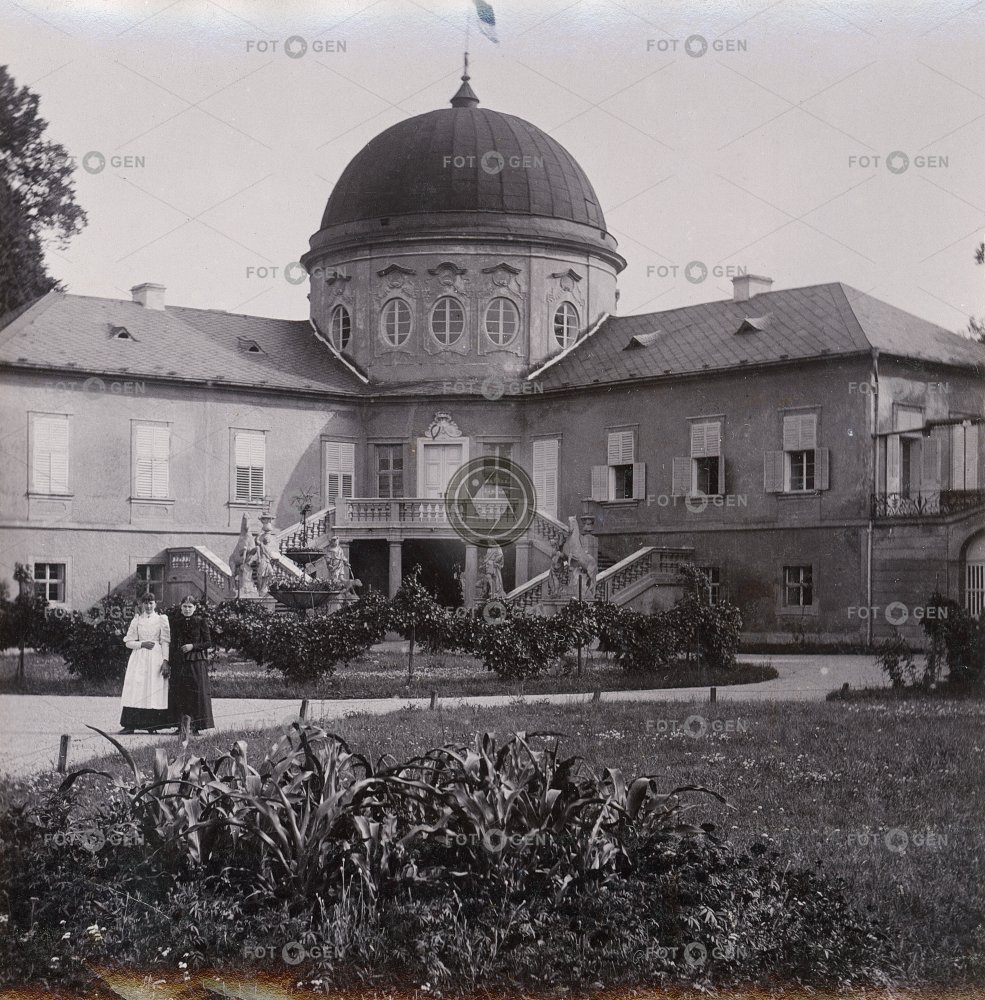 Veltrusy, centrální část zámku s dvouramenným schodištěm, polovina stereofotografie, kol 1893