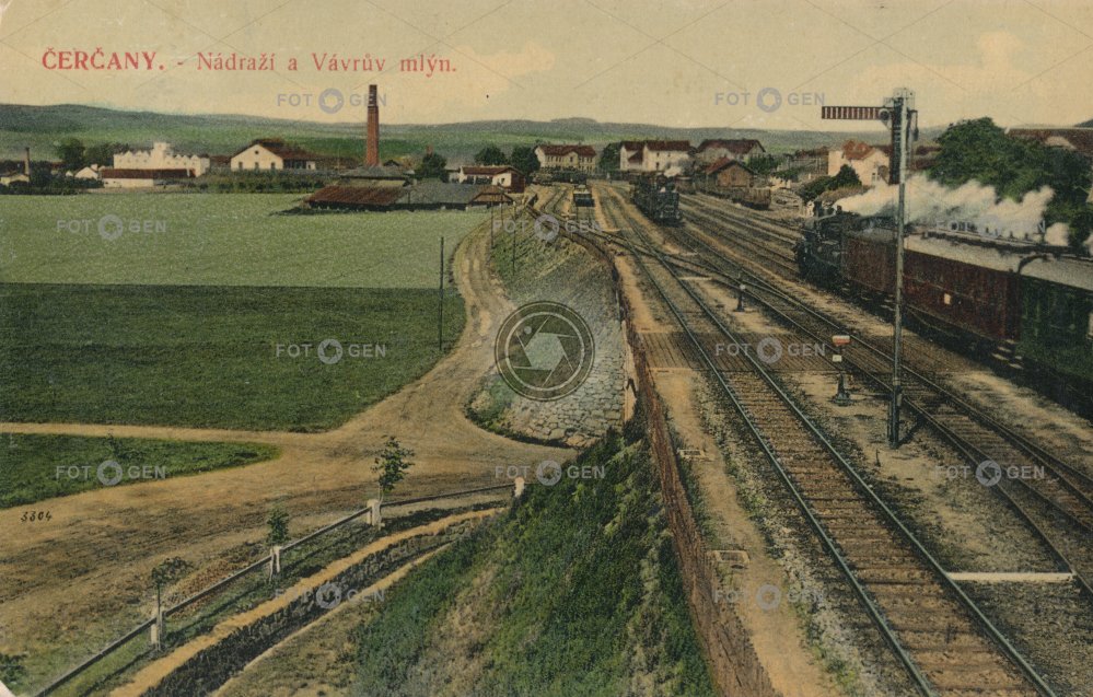 barevná colored Čerčany doprava dvouramenné kolorovaná mechanické návěstidlo mill místopis mlýn návěstidlo panorama panoramatický Středočeský topography traffic light train transport Tschertschan two-armed Vávrům mlýn Vávrův