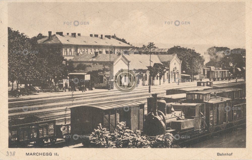 1915 Austria Ausztria Bahnhof budova Dolní Rakousy doprava dráha Marchegg místopis nádraží nádražní Niederösterreich Österreich Osztrák-Magyar Monarchia pociąg railway station Rakousko stacja kolejowa stanica station topography train Train Station transport vagon vagony vasútállomás vlak vlakové nádraží vonat Zug železnice železniční