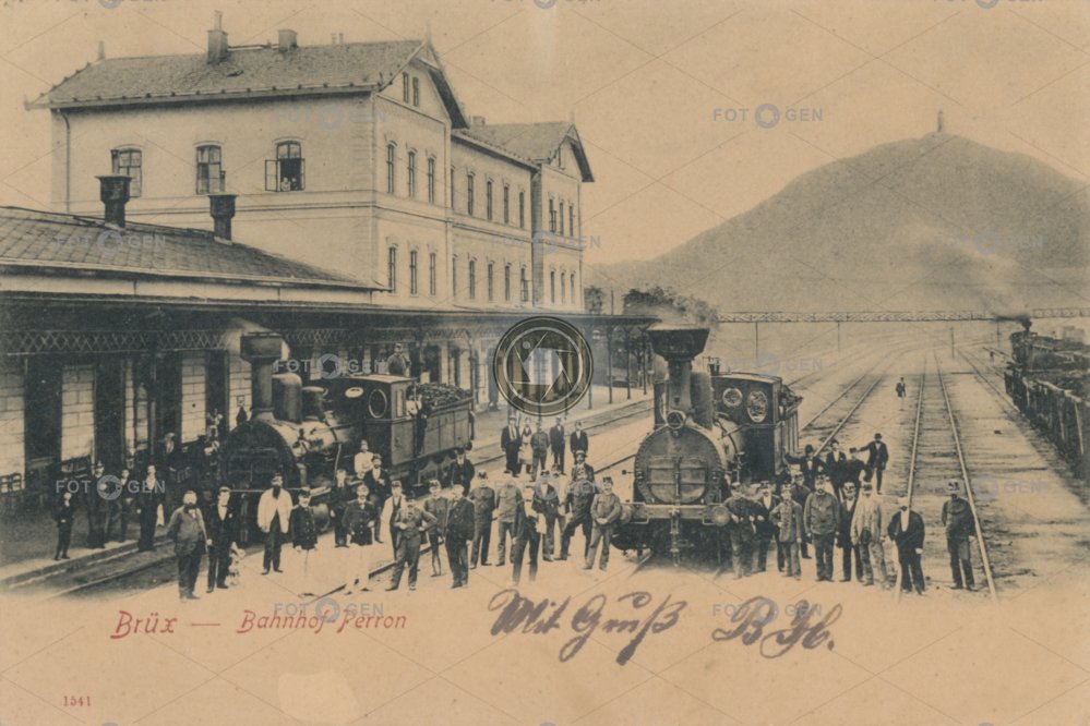 alive Brüx budova cestující doprava dráha dráhy Hněvín hrad lidé locomotive lokomotiva mašinka místopis most nádraží nádražní parní lokomotiva steam locomotive tender tender lokomotiva topography Train Station transport trať vlak vlakové nádraží zaměstnanci známka železniční živá