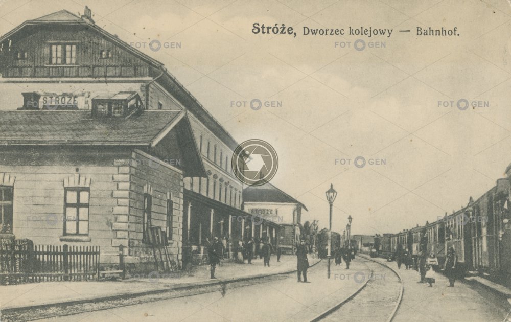 1916 budova cestující doprava dráha lidé místopis nádraží nádražní Polska Polsko railway station station Stróże topography train transport trať vlak železniční