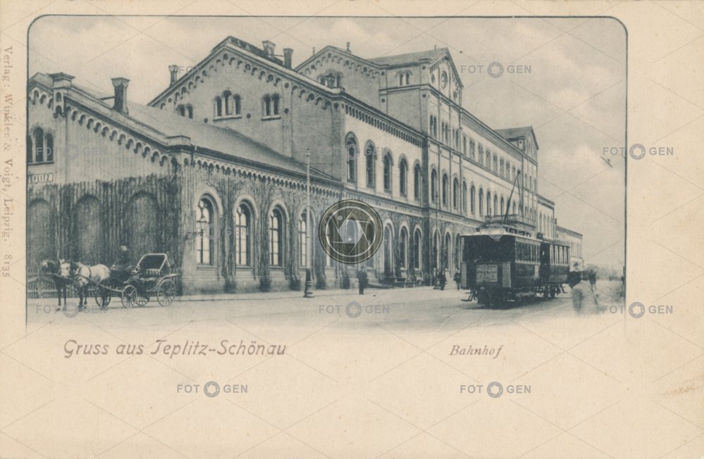 1901 budova cultural Heritage doprava dráha drožka fiakr Josef Turba kočár koňský kulturní památka místopis nádraží nádražní Nádražní náměstí novorománská railway station Rundbogenstil Teplice Teplitz Teplitz-Schönau topography Train Station tram tramvaj transport trať vlakové nádraží vlečka železniční