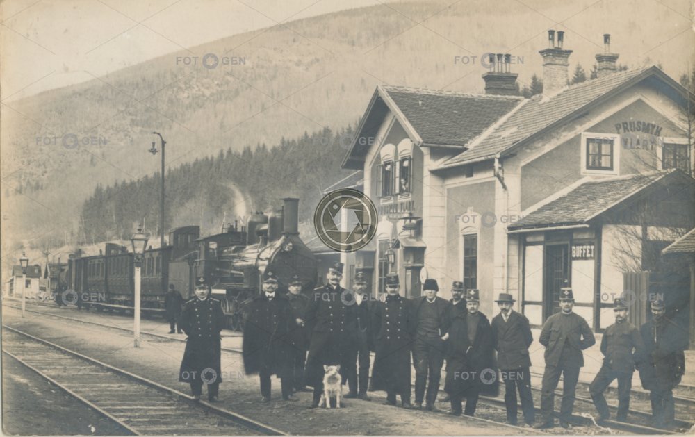 1908 alive büfé bufet buffet dog doprava dozorčí provozu dráha dráhy employee employees lokomotiva místopis osobní osobní vlak parní lokomotiva passenger train pes průsmyk přednosta stanice stationmaster steam locomotive topography Train Station transport trať uniform uniforma vlak vlakové nádraží Vlárský Vlary zaměstnanci železniční živá