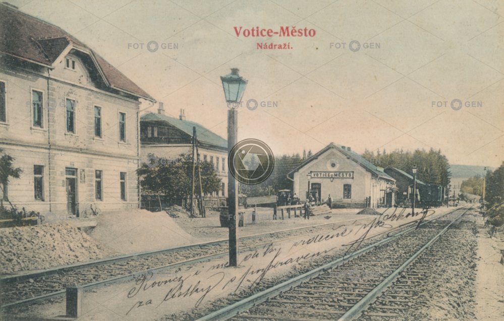 barevná budova colored doprava dráha kolorovaná lighting místopis nádraží nádražní osvětlení pouliční osvětlení topography Train Station transport trať vlakové nádraží Votice železniční železniční trať