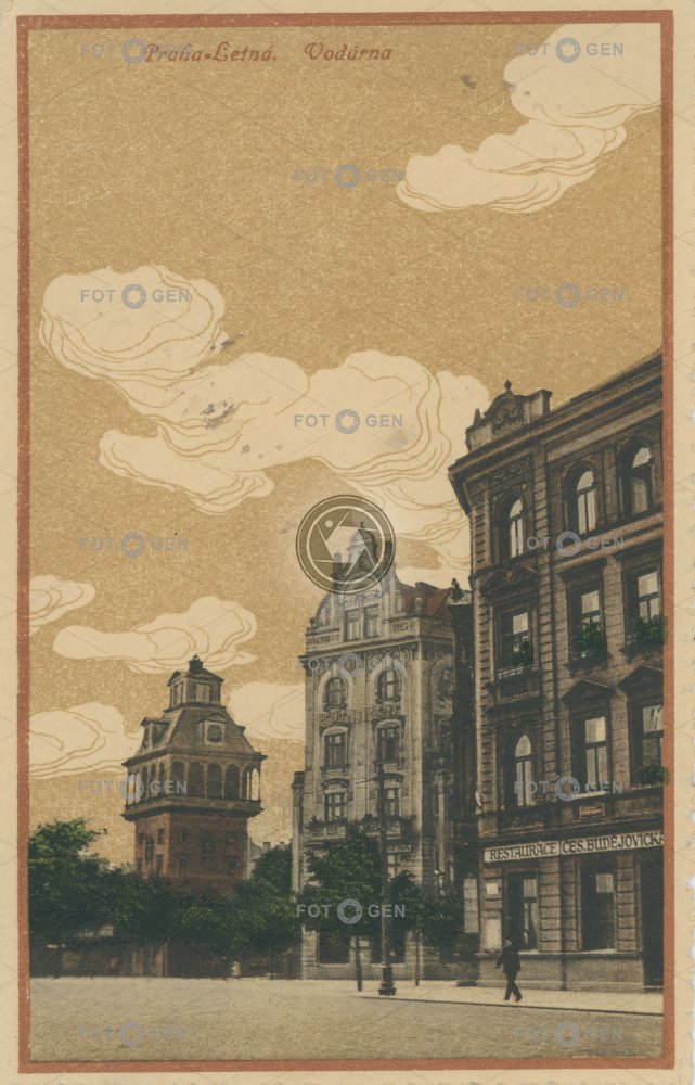 1915 barevná colored Holešovice Jindřich Fialka Letná Milady Horákové místopis Občanská záložna Prague Praha Praha 7 restaurace restaurant street topography tower union vodárenská věž Letná vodárna Volavka water tower waterworks záložna