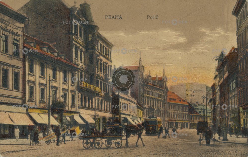 1923 alive barevná barrow colored dvoukolák ekvipáž equipage handcart horse-drawn carriage malba místopis Na Florenci Na Poříčí New Town Nové Město Poříč Poříčská Prague Praha ruční vozík topography tram tramvaj tramvaj 7 živá