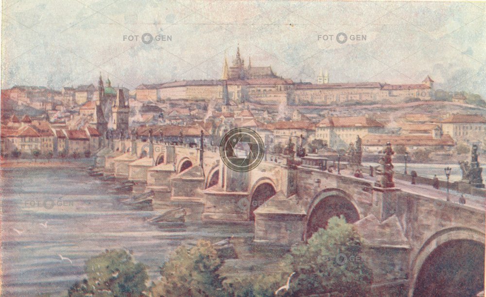 akvarel art barevná castle Steps colored Ferdinand Engelmüller Hradčany Charles Bridge Karlův most kresba Lesser Town Malá Strana malba místopis obraz Picture Prag Prague Praha topography umění Vltava Watercolor painting Zámecké schody
