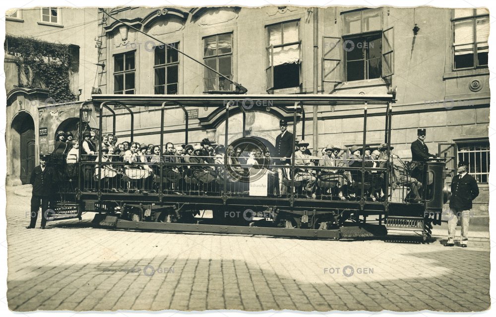 conductor doprava hiking kladka léto místopis okružní jízda open car otevřený vůz posing pózování Prague Praha průvodčí pulley sightseeing summer topography tourists tram tramvaj transportation turisté turistika view vyhlídka