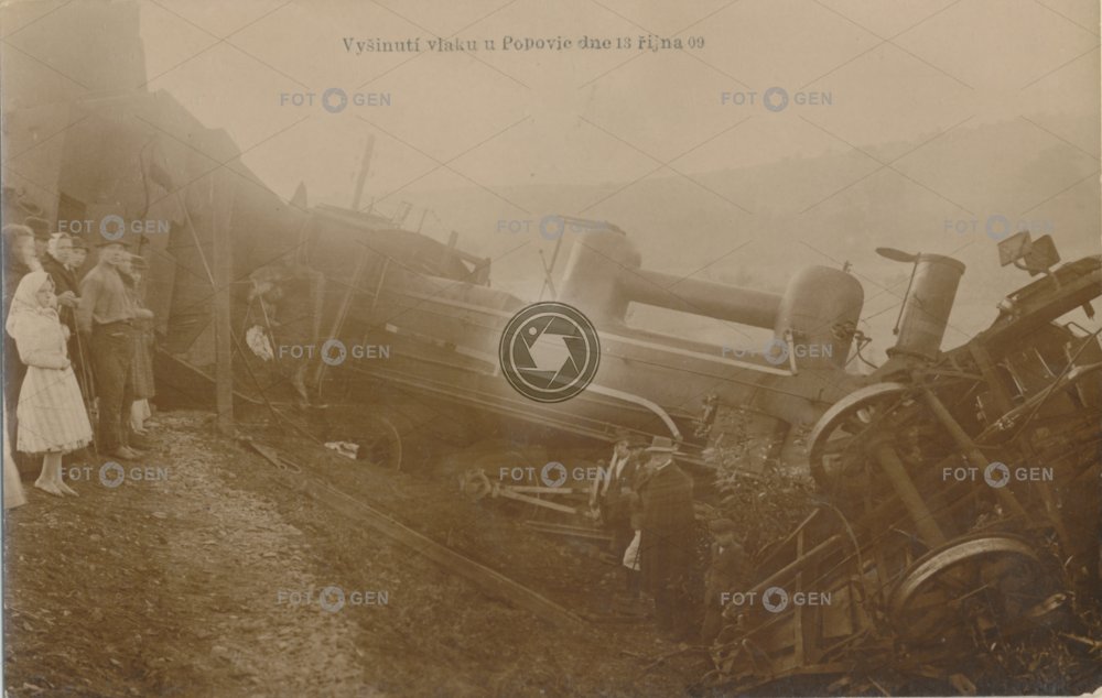 1909 alive doprava dráha event havárie lokomotiva místopis nehoda neštěstí parní lokomotiva Popovice steam locomotive topography train crash train derailment transport trať událost vlak vlaková nehoda vykolejení železniční živá