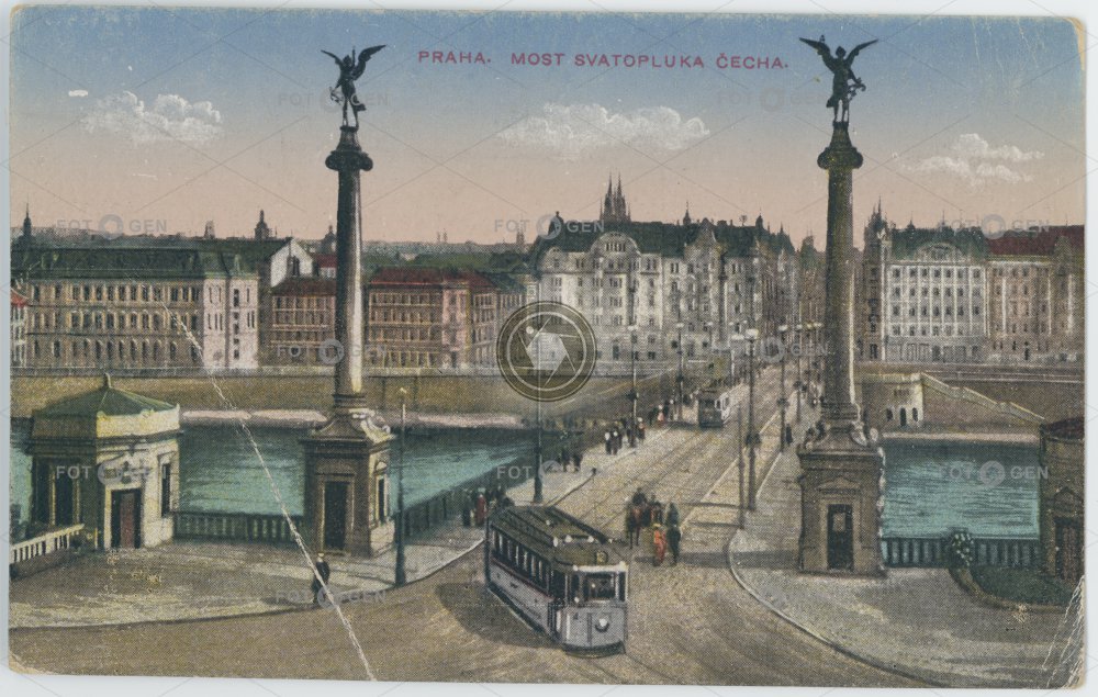 1919 Antonín Popp Art Nouveau barevná bridge color colored Čechův most Josefov kolorovaná Mikulášská místopis most Pařížská Prague Praha river řeka sculpture secese sloup socha statue Svatopluka Čecha světlonoš topography tram tramvaj Viktorie Viktorií Vltava židovské město