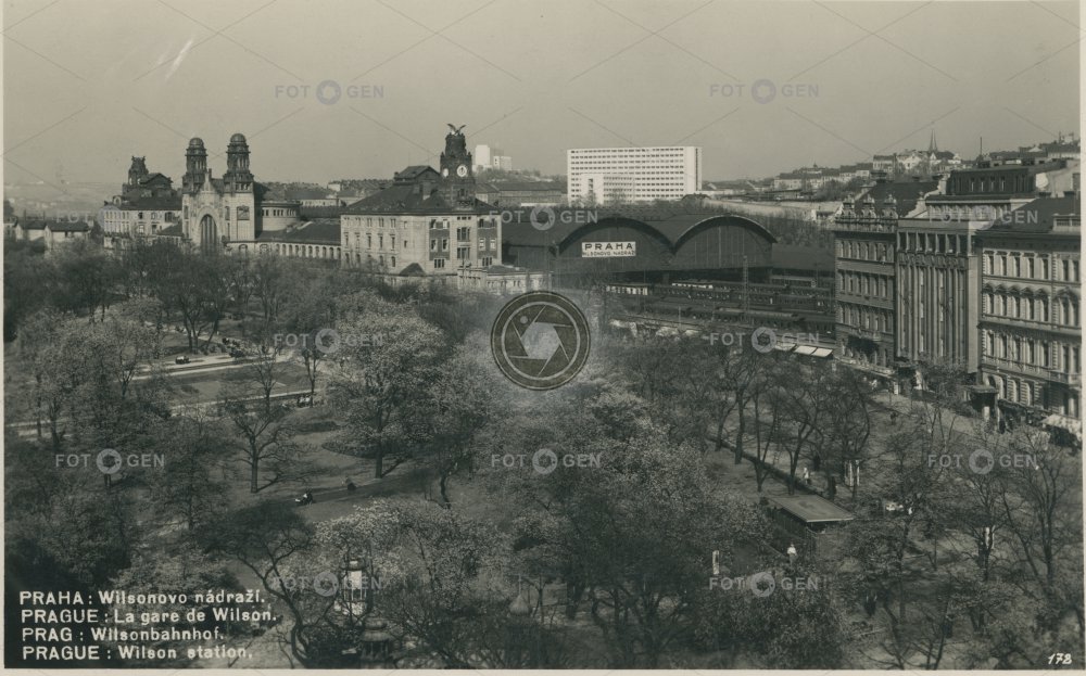 celkový pohled Dům odborových svazů Hlavní nádraží Hooverova hotel Městský sad místopis nádraží Nové Město panoram panorama panorama view park Prague Praha railway station railway station building station the New Town topography train třída vlak Vrchlického sady Všeobecný penzijní ústav Wilson Wilsonova Wilsonovo nádraží Žižkov