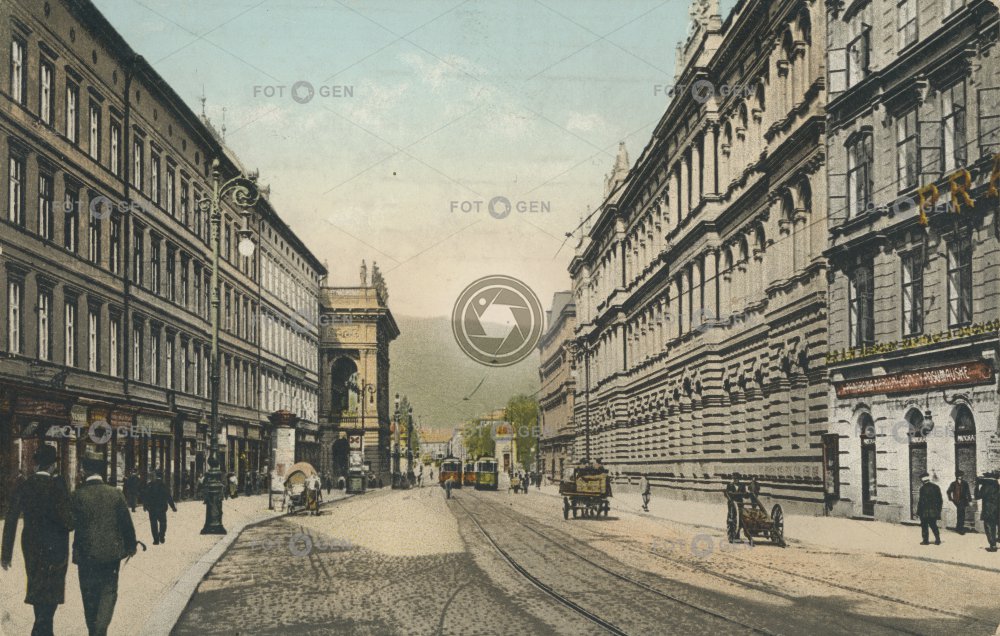 1905 barevná barrow Classicism color colored dvoukolák Ferdinandova handcart Chaura Kaura klasicismus kolorovaná místopis Národní Národní divadlo National Theatre Neo-Renaissance Nové Město novorenesance Old Town osvětlení pouliční lampa Prague Praha ruční vozík savings bank Staré Město street lamp the New Town topography