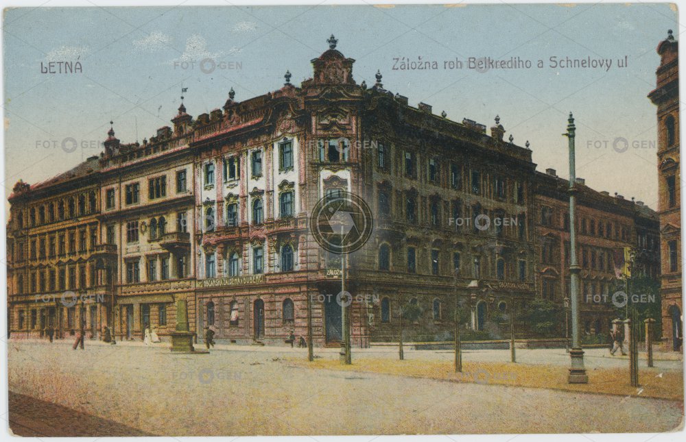 bank banka barevná Belcrediho Belcrediho street Belcrediho třída colored Holešovice kolorovaná Letná Milady Horákové místopis penzijní ústav Prague Praha Praha 7 Schnelova Schnelova ulice Šmeralova topography union záložna