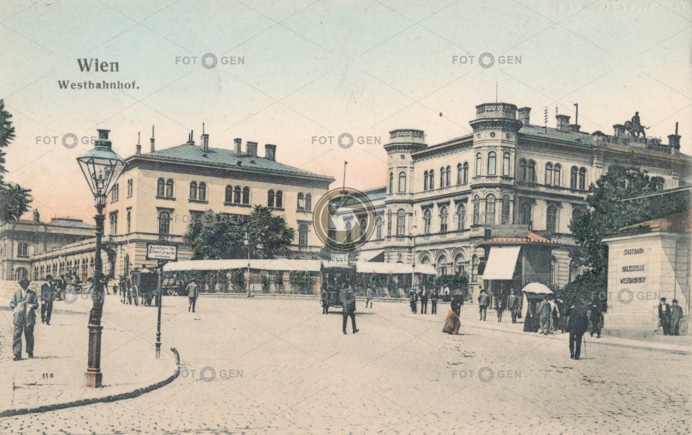 1914 Austria Ausztria Bahnhof barevná Bécs budova colored doprava dráha kolorovaná lampa lampy lighting místopis nádraží nádražní Nyugati pályaudvar Österreich osvětlení pouliční pouliční osvětlení Rakousko stacja kolejowa station street lamp topography transport trať vasútállomás Vídeň Vienna világítás Westbahnhof Wien západní železnice železniční