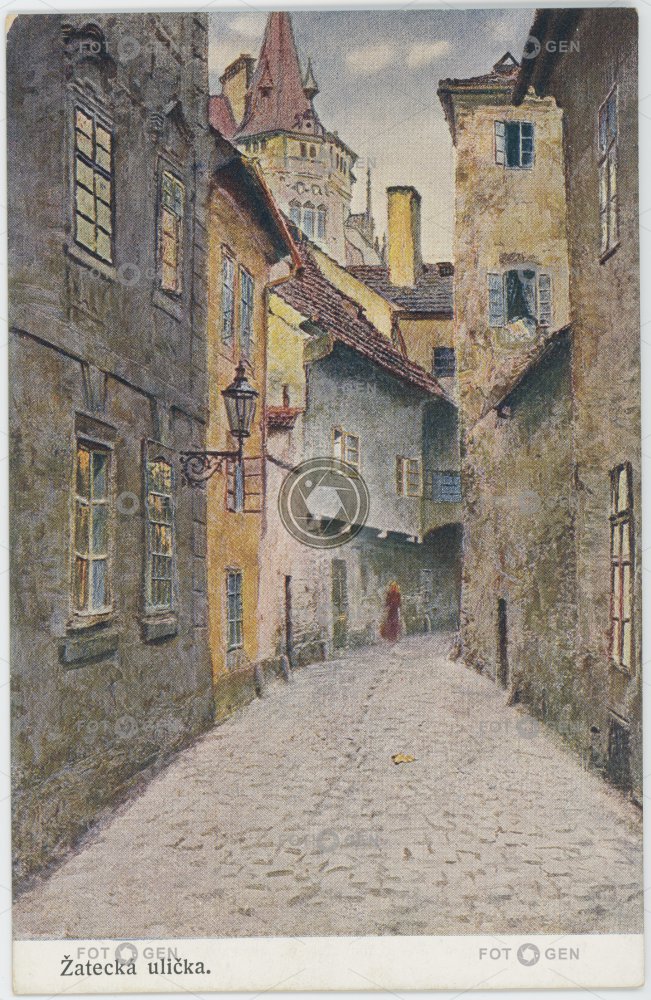 art autotypie barevná colored čtyřbarevná autotypie drawing kolorovaná kresba malba místopis painting polotón pouliční lampa pouliční osvětlení Prague Praha street lamp topography ulička umění Žatecká