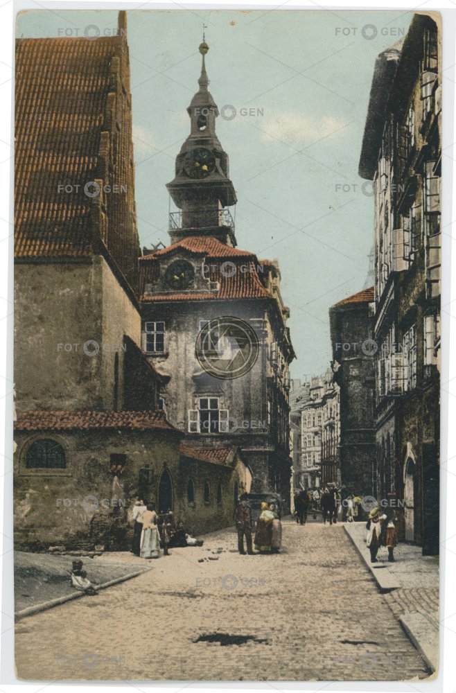 1913 barevná colored Jewish ghetto Jewish Heritage Jewish town Jewish Town Hall Josefov Judaism Judaismus kolorovaná Maiselova místopis Old-New Synagogue Prague Praha Rabínská radnice Staronová synagoga synagoga synagogue The Jewish Town topography tower town hall ulice Maiselova ulice Rabínská věž židovská památka židovské geto židovské ghetto židovské město