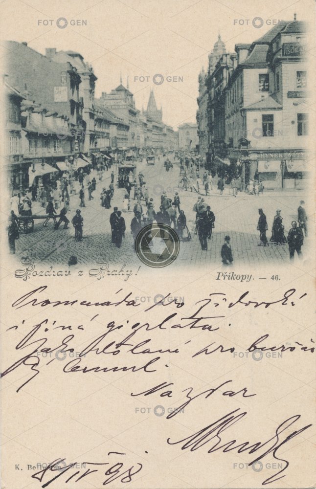 1898 alive barrow dvoukolák Golden Cross koňka kříž lidé místopis Na Příkopě náměstí New Town Nové Město poeple pouliční pouliční ruch Prague Praha Příkopy ruch square street traffic topography tramvaj Václavák Václavské Wenceslas Wenceslas Square Zlatý Zlatý kříž živá