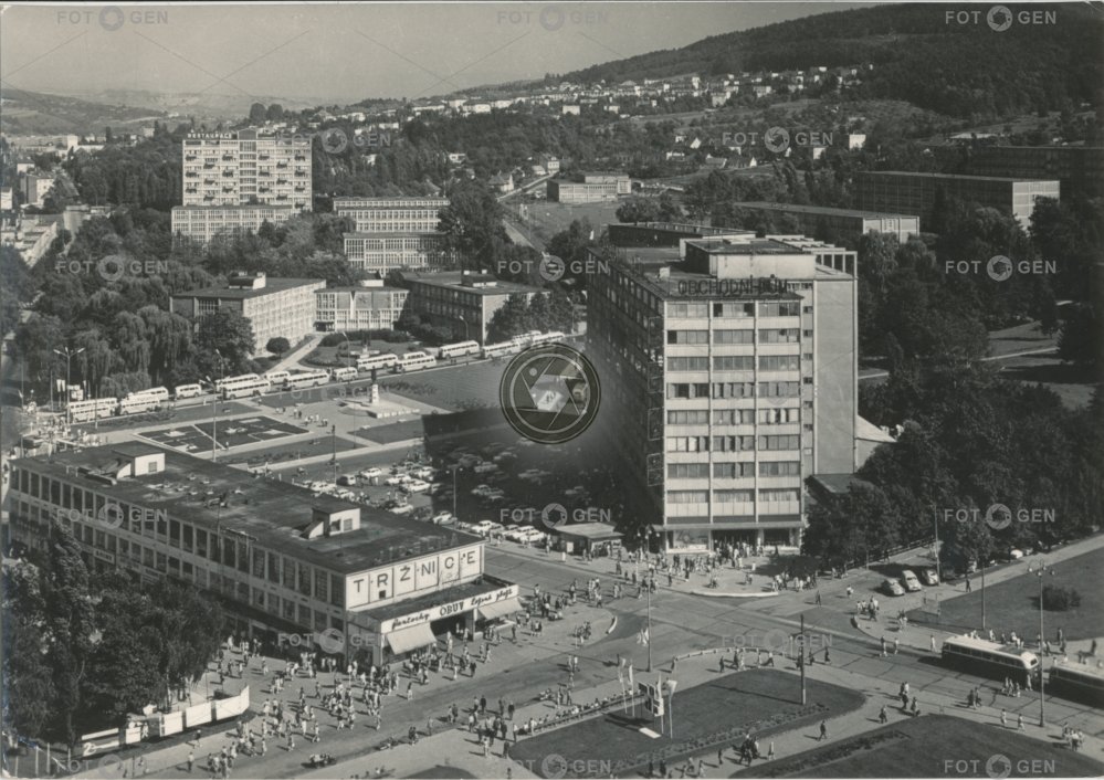 Zlín (Gottwaldov) - Pohled z mrakodrapu - Obchodní dům Předvoj - Tržnice - v pozadí Školní čtvrť a Masarykovy školy. Zlín (Gottwaldov) - view from the skyscraper - Tržnice - Prior department store - Masaryk school
