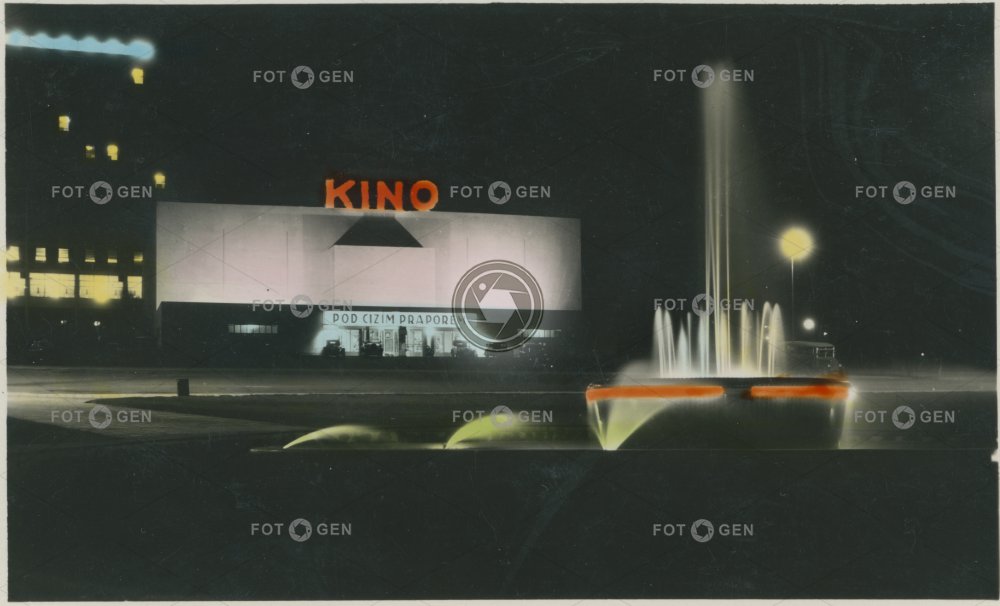 barevná biograf cinema color colored fontána fountain kašna kino kolorovaná místopis náměstí Práce neon lights neony noční práce topography večerní Velké kino Zlín