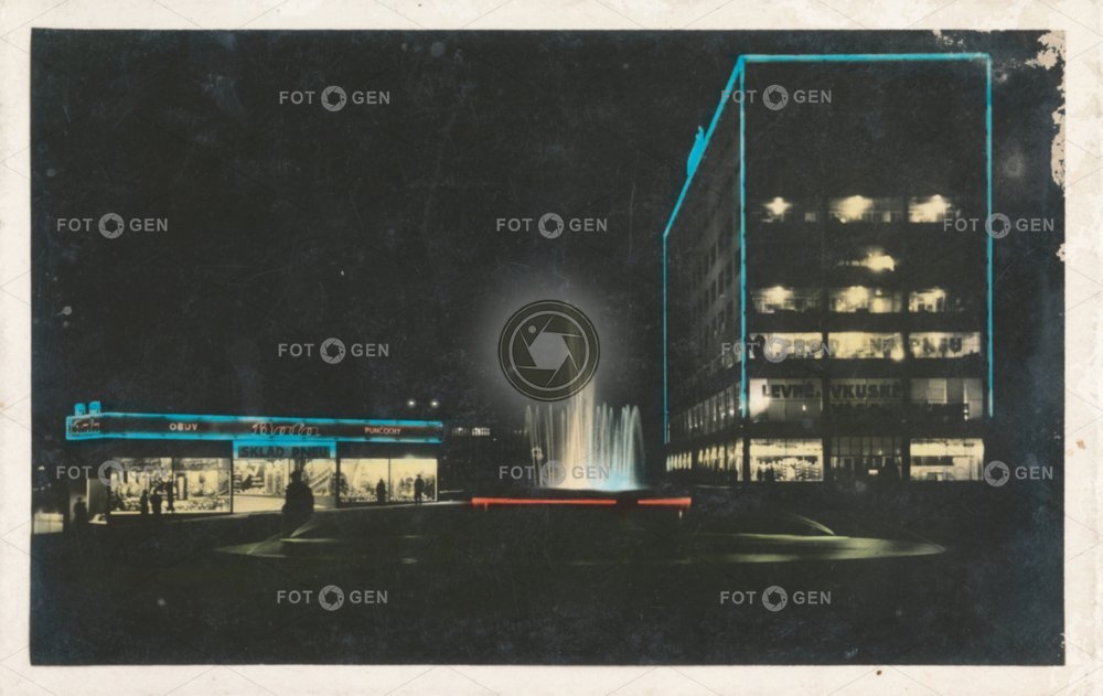 barevná color colored department store evening fontána fountain kašna kolorovaná místopis náměstí Práce neexistující objekt neon lights neony night noc noční non-existent obchodní dům store topography tržnice večerní Zlín