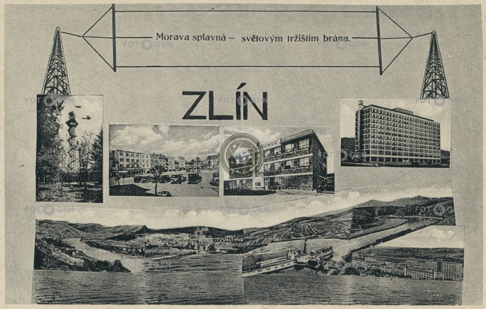 Baťa Baťa factory Baťov Baťova nemocnice Baťův kanál collage Dřevnice Gottwaldov hotel hotel Moskva koláž místopis Morava Morava splavná náměstí Míru Otrokovice řeka Společenský dům Tlustá hora topography Zlín