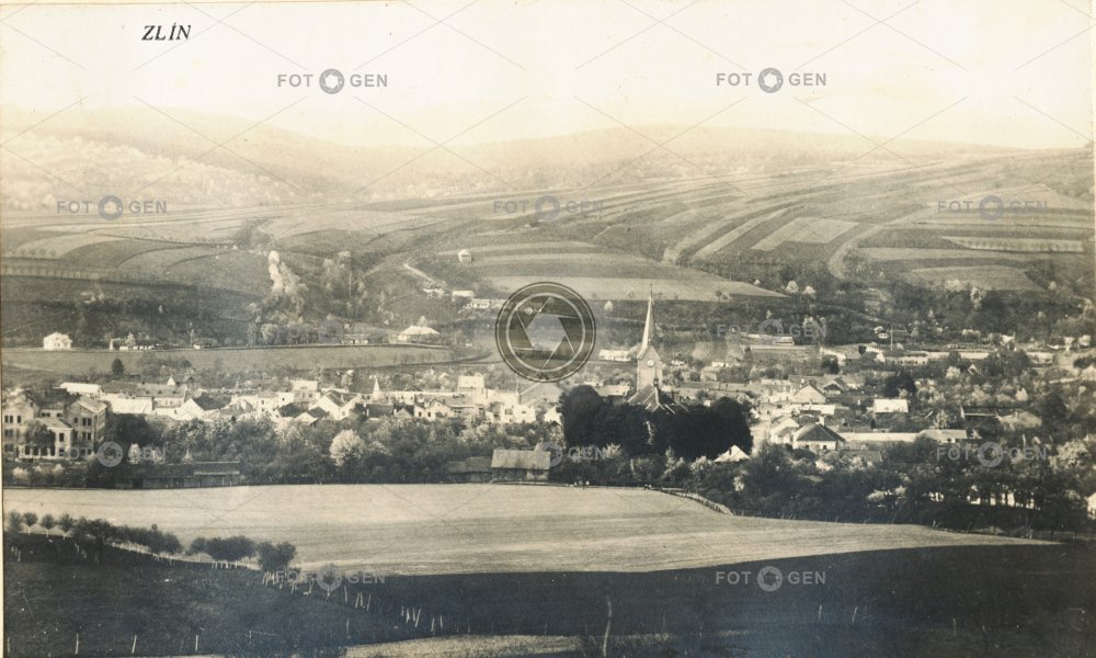 Panoramatický pohled na Zlín na ještě zcela holá pole, kde se dnes rozprostírá sídliště Jižní Svahy. Panoramic view of Zlín on the still completely bare fields, where today extends housing estate Jižní Svahy.